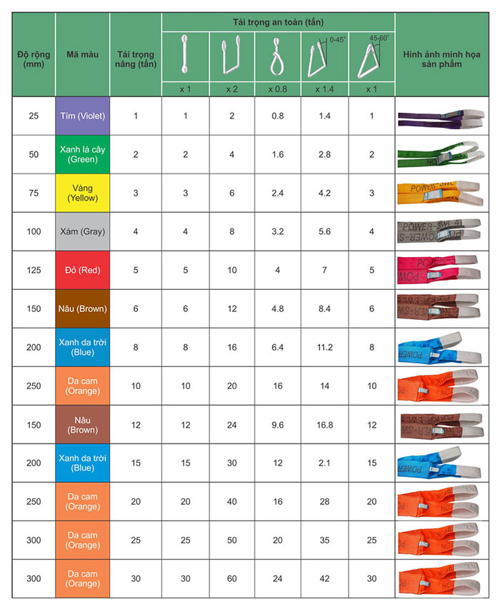 – Mỗi 25mm bản rộng của dây tương đương 1 tấn tải trọng.