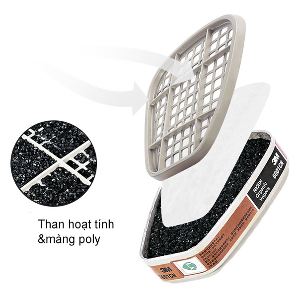 - Phin lọc 3M 6001 có cấu tạo từ than hoạt tính và màng poly. Bảo đảm khả năng loại trừ siêu vi, chất thải hữu cơ như rác thải, xác động thực vật…